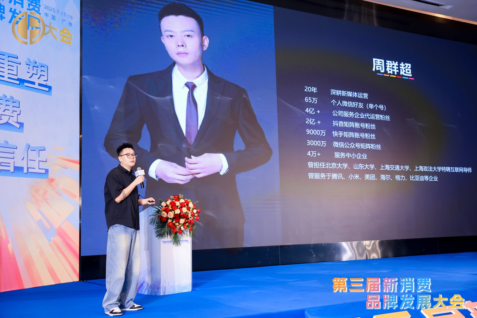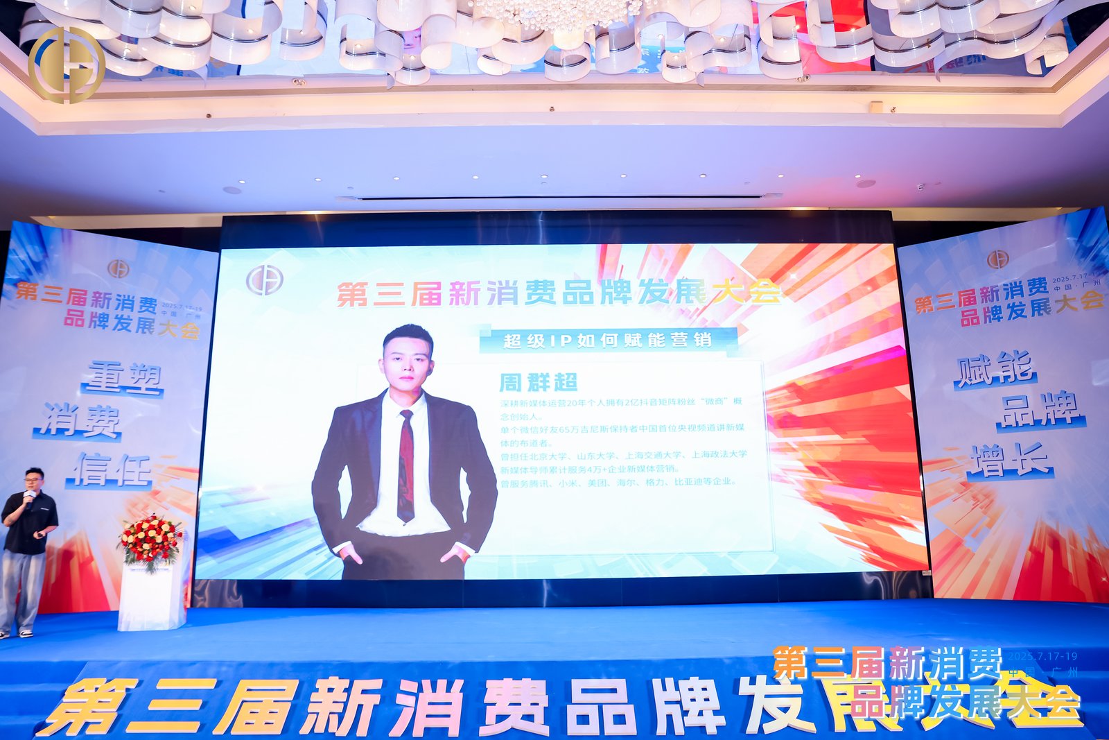 大家下午好!我是周群超。今天站在这个讲台上,我首先要感谢大会主办方给予的机会,让我能和在座各位优秀的行业同仁分享一些关于新媒体营销的实践与思考。这两年我走访了全国上百个市县,接触了数千位企业家,深刻感受到一个变化——过去是品牌带着人走,现在是人带着品牌跑。这种转变背后,正是超级IP时代悄然来临的信号。