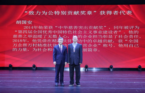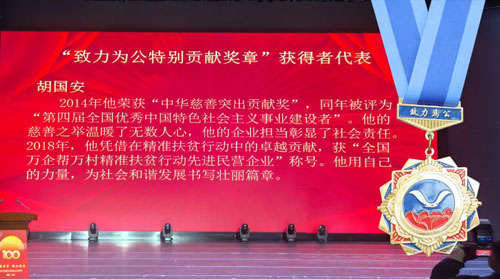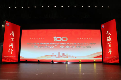演出前举行了隆重的“致力为公”奖章颁奖仪式。在热烈的掌声中,胡国安董事长上台接受“致力为公”特别贡献奖章。颁奖辞写到:“2014年他荣获‘中华慈善突出贡献奖’,同年被评为‘第四届全国优秀中国特色社会主义事业建设者’。他的慈善之举温暖了无数人心,他的企业担当彰显了社会责任。2018年,他凭借在精准扶贫行动中的卓越贡献,获‘全国万企帮万村精准扶贫行动先进民营企业’称号。他用自己的力量,为社会和谐发展书写壮丽篇章。”此项荣誉正是对他多年来在参政议政、社会服务、侨海联络,特别是在公益慈善与乡村振兴等领域持续贡献的高度认可,充分体现了致公党湖南省委会对优秀党员坚守“致力为公、侨海报国”初心的肯定与褒扬。