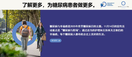 2025年世界糖尿病日的主题是“糖尿病与幸福感”(Diabetes and well-being),旨在通过适当的护理和支持来关注糖尿病人群的福祉,每个糖尿病人都有机会过上美好的生活。