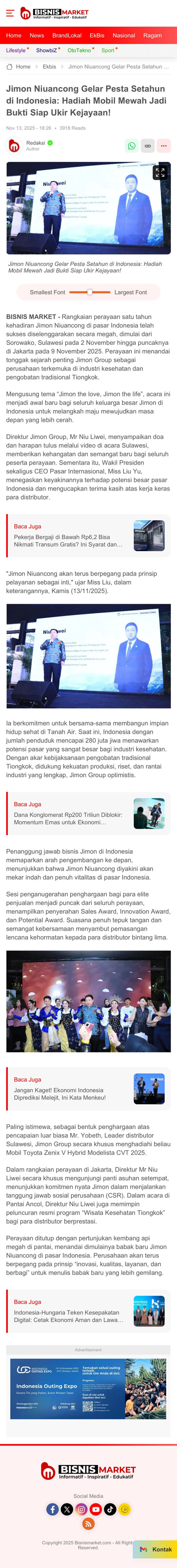 印度尼西亚当地媒体BISNISMARKET(印尼商业网)对本次活动进行了权威报道,以下是媒体报道原文: