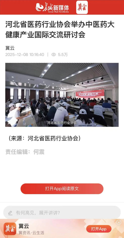 2025年12月6日,由河北省医药行业协会主办,金木集团、保定中药等单位联合承办的“东方本草・健康共享——中医药大健康产业国际交流研讨会”在“千年药都”河北安国隆重召开。
