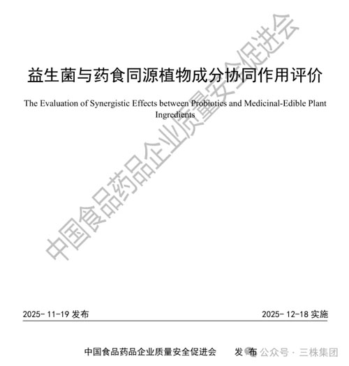 2025年11月19日,由中国食品药品企业质量安全促进会组织并主持起草,众多企业单位、高校及科研机构共同参与起草的《益生菌与药食同源植物成分协同功效评价》团体标准(标准号:T/FDSA 0104-2025)制定出台。