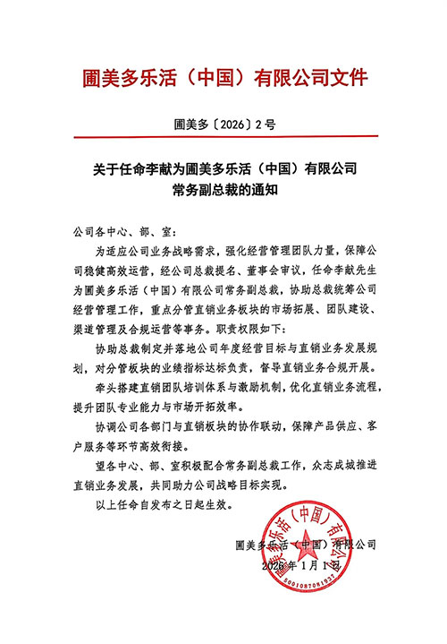 2026年1月1日,圃美多乐活(中国)有限公司(以下称圃美多乐活)正式发布编号为圃美多〔2026〕2号的人事任命通知。经公司总裁提名、董事会审议通过,李献先生荣膺公司常务副总裁,将协助总裁陶剑俊先生统筹公司整体经营管理工作,重点聚焦直销业务板块的战略落地与效能升级,为品牌深耕中国市场、强化核心业务竞争力注入全新动能。