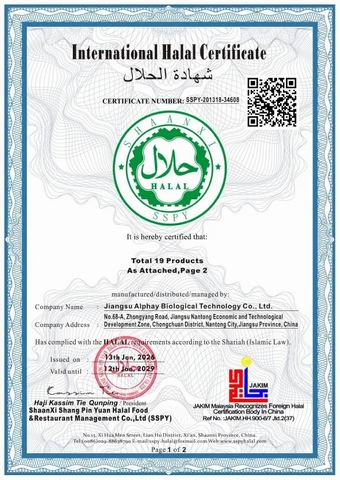 2026年1月13日,江苏安惠生物科技有限公司(Jiangsu Alphay Biological Technology Co., Ltd.)获得国际HALAL认证证书,证书编号为SSPY-201318-34608。该认证由马来西亚伊斯兰发展署(JAKIM)认可,标志着安惠生物科技的相关核心产品符合伊斯兰教法(Shariah)规定的HALAL标准,为其在全球清真市场的布局提供了重要保障。
