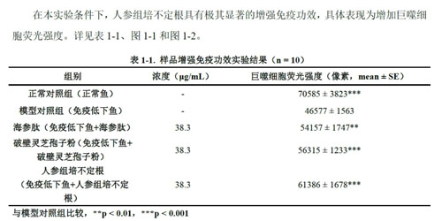 在斑马鱼增强免疫功效测试中,人参组培不定根表现突出,功效显著优于破壁灵芝孢子粉和海参肽。其增强免疫的功效是破壁灵芝孢子粉的1.09倍,是海参肽的1.13倍。