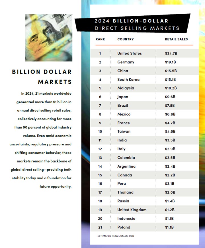 中国属于一个独特的类别。经过数年的收缩,市场在2024年回归增长,这为直销恢复20周年提供了有力的动力信号。监管依然较为严密,但此次反弹表明企业和消费者都在谨慎地重新参与。