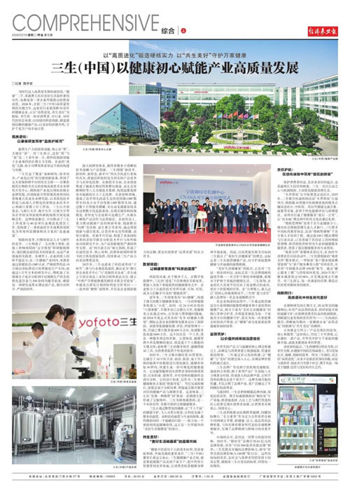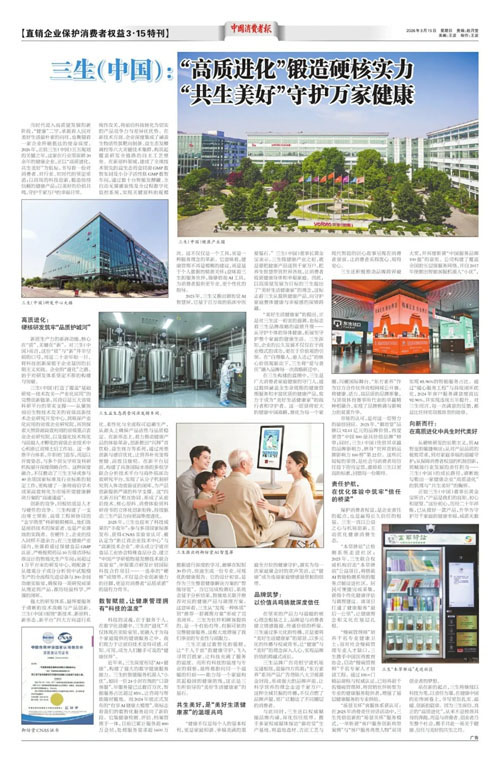 3月15日,中国消费者报推出了《2025年直销企业保护消费者权益3·15特刊》,其中以《三生(中国):以“高质进化”锻造硬核实力,以“共生美好”守护万家健康》为题,特刊对三生(中国)进行了整版的专题报道。